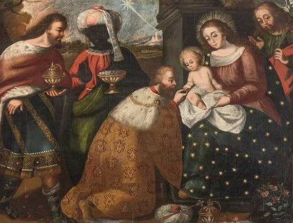The above artwork is Adoration of the Magi by an unknown artist at the Cusco School, Peru 1730-1760. Public Domain in the US.