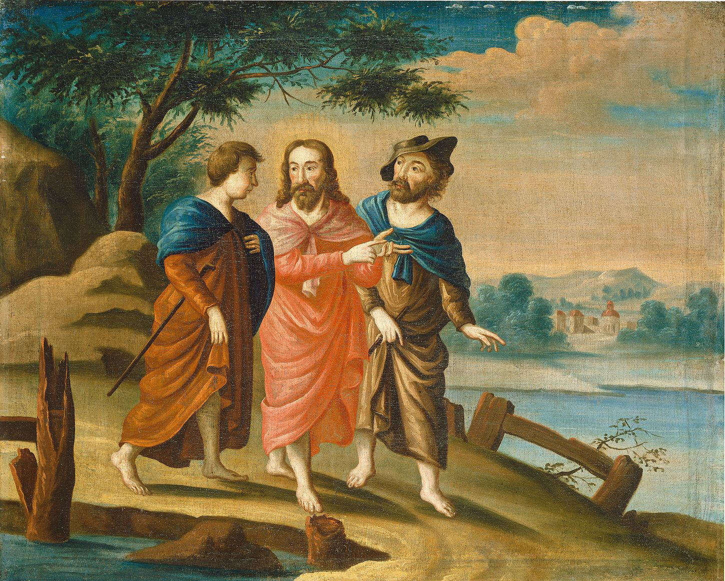 The above artwork is Christ on the Road to Emmaus, c. 1725/1730 by an unknown American artist. National Gallery of Art, Washington, DC. Public Domain in the US.